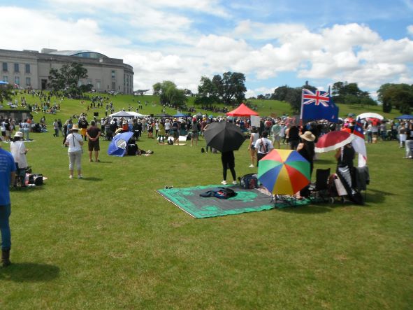 The weekly protest at at the Auckland domain was more of a low key affair this week, but it was notable for a long speech by Brian Tamaki of the Destiny Church.