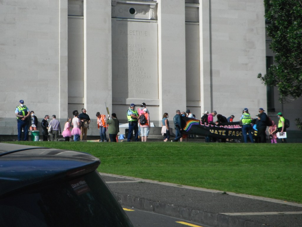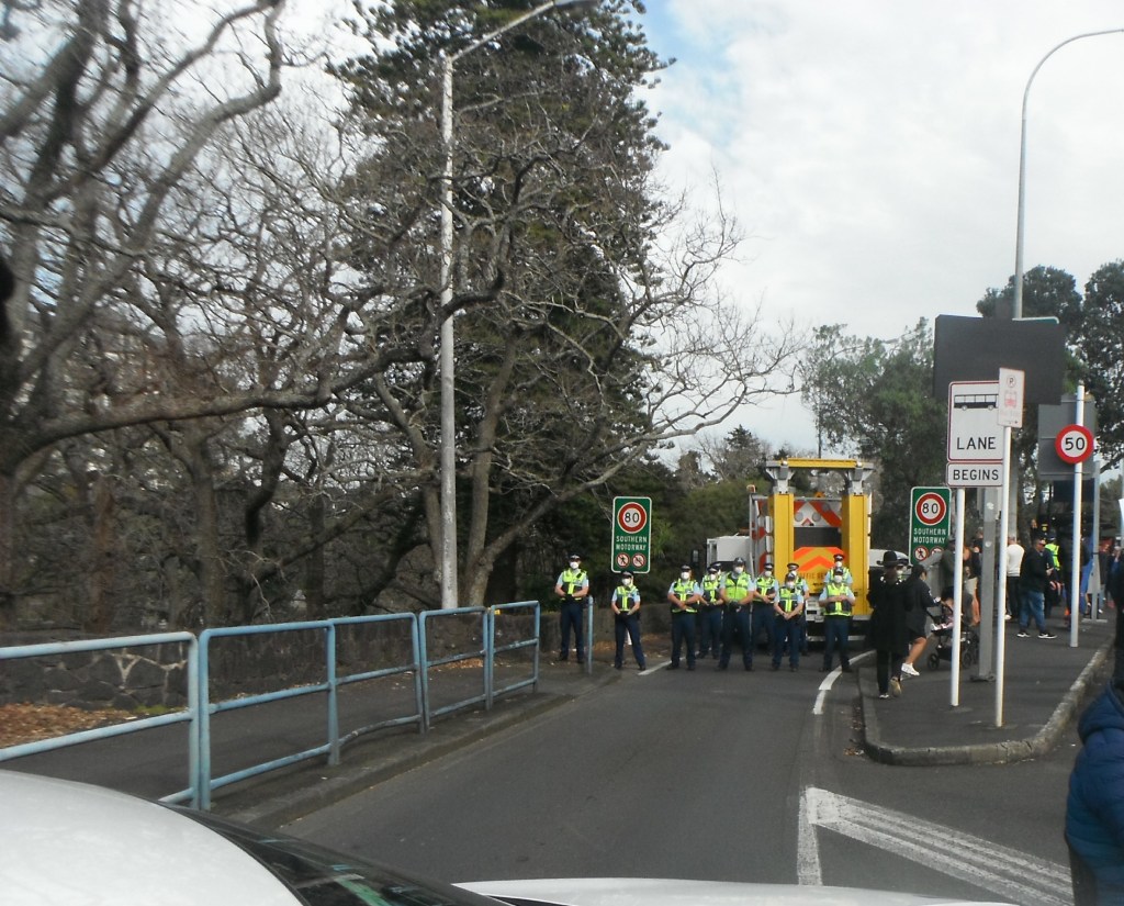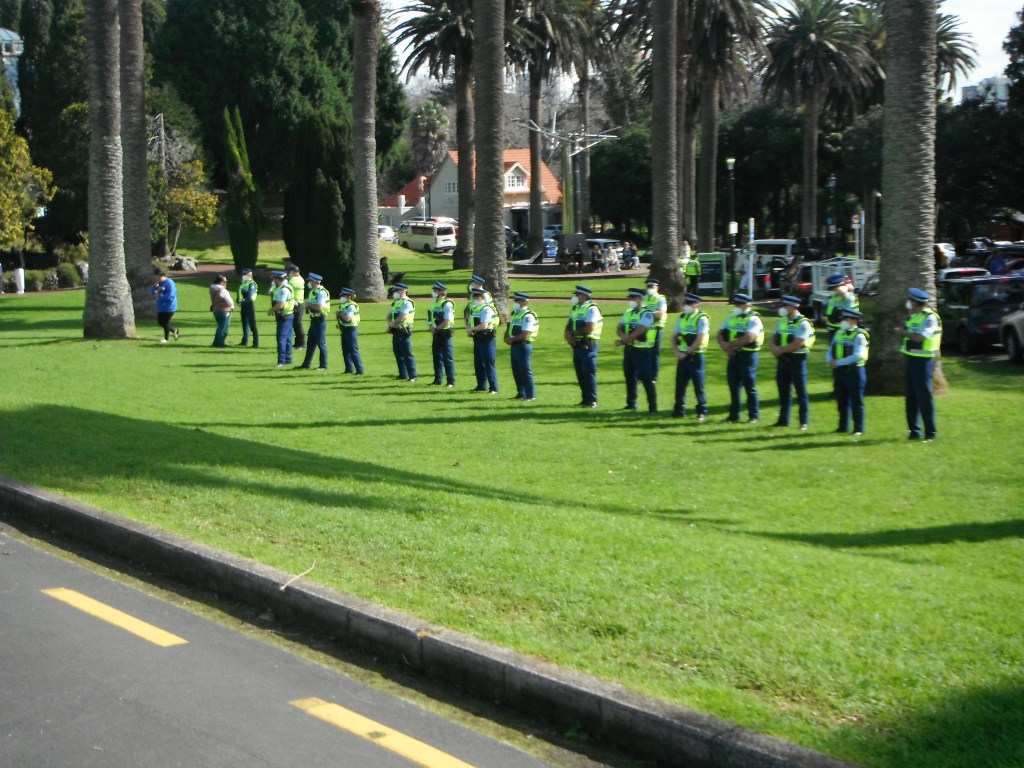 There was a heavy Police presence this time. I think this was because of the counter protest in the same area, but also the fact that the police got outsmarted at the last protest, when they obligingly escorted the protesters onto the motorway. The motorway entrances were heavily Policed this time and there were police officers escorting us all the way around on the march around Auckland city.