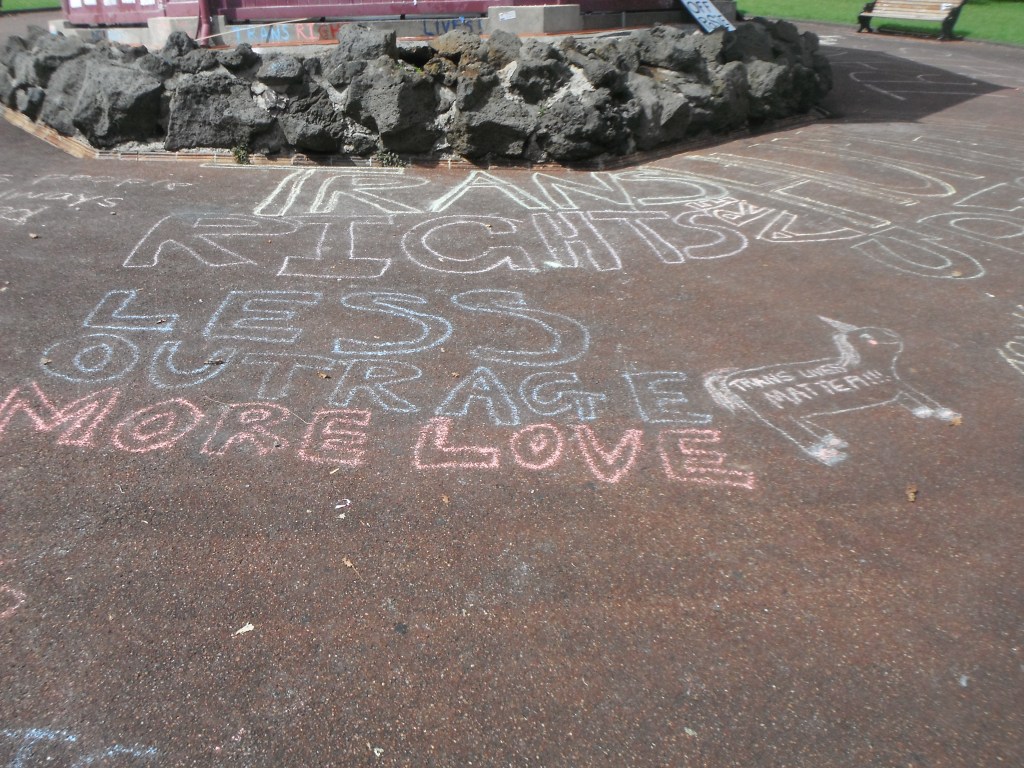 Eventually, Vision NZ decided to march down Queen st. The rainbow crowd couldn’t stop this, so they walked on the footpath next to them making lots of noise. They all finished up at the bottom of Queen st, where Vision NZ did a haka (a traditional Maori song/dance) and the tranz crowd tried to stare them down.