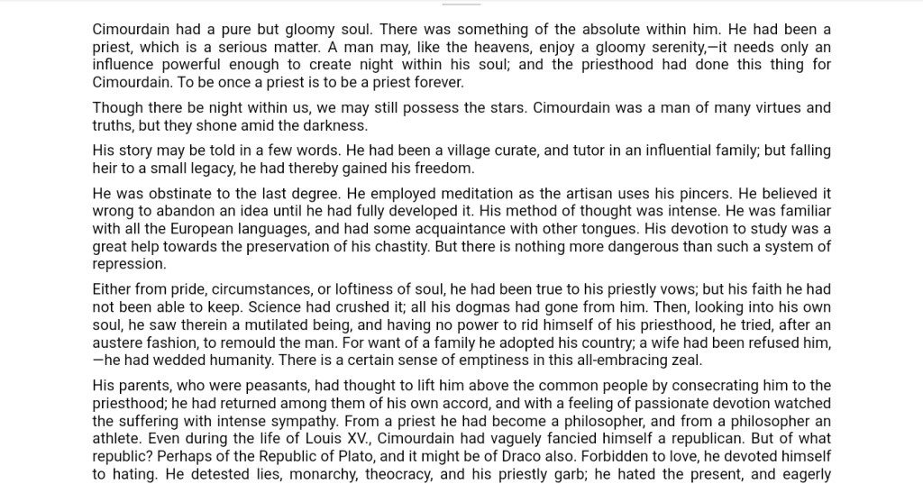 This is a challenging book to read because it’s written in that typical poetic style that Victor used. It was originally written in french, and occassionally there is a french word that doesn’t have an english equivalent. It’s still fairly easy to work out what he means though. It sort of makes the book into a sort of puzzle that needs solving, but it’s very rewarding to read in the end.