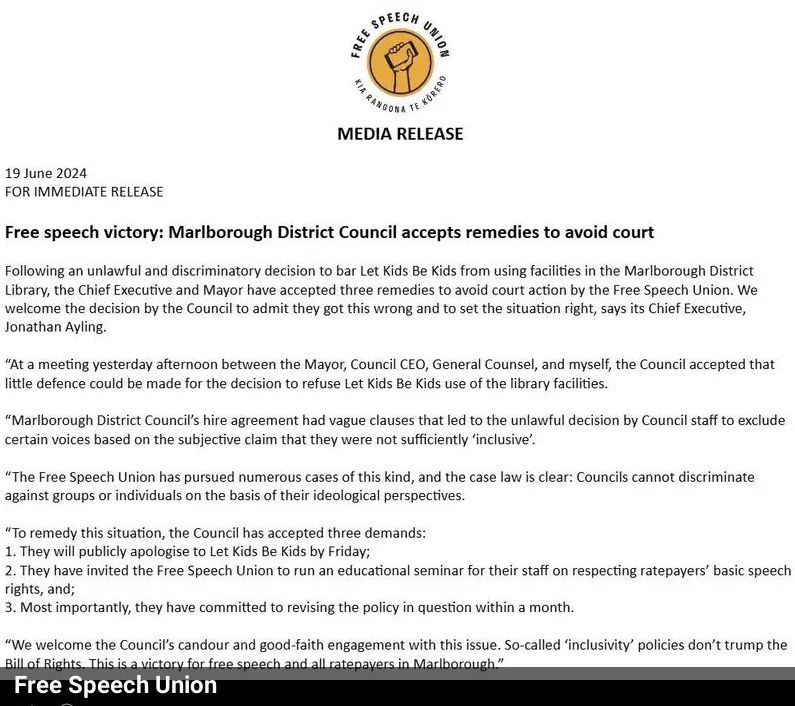 The Free Speech Union forced the Marborough city council to back down from allowing ‘Let kids be kids’ from using a public library.