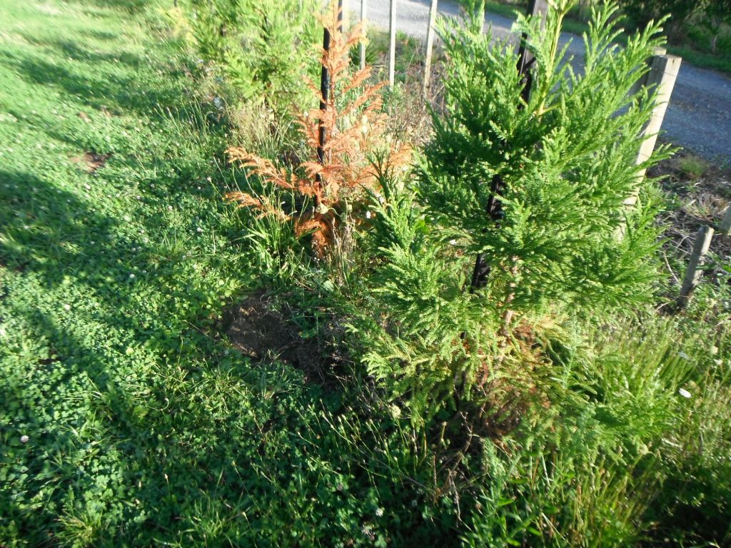 We have a row of Japanese Cedars.. All of them are doing quite except one!, I have no idea why. I throw extra water at it than the others get, so it’s kept just a little bit of green, right at the top.