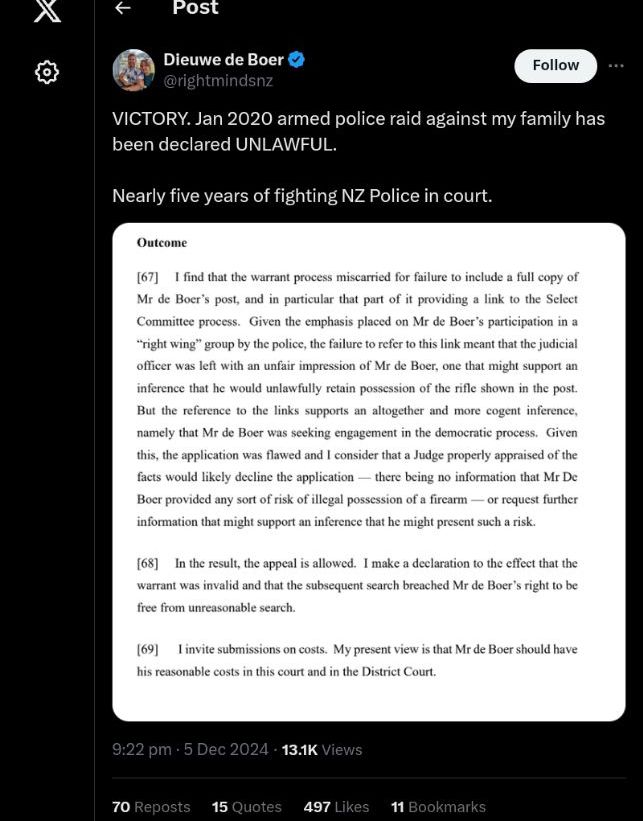 Police raided Dieuwe’s home, terrorising his family, in response to a politically motivated anonymous tip-off complaining that he had “far right” views and owned a firearm banned under the Ardern government’s new laws. Dieuwe had already disposed of the firearm.